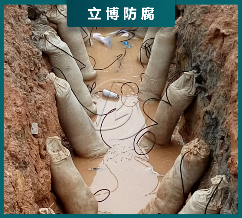 在土壤干燥地区阳极放入土坑后,应将填包料用水充分浸透后方能回填土,以免阳极不能充分导电。